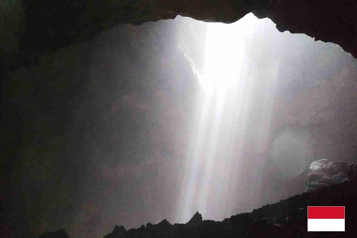中岜朗天坑(Goa Jomblang) 印尼地處太平洋火山環帶上 , 發生在大約180萬年前, 火山運動把印尼島嶼石灰岩地行從海底抬升之後 , 塌陷坑的底部(未地殼運動所影響)與水平通道相連,行成了現在的地底洞穴及地下水道系統 。